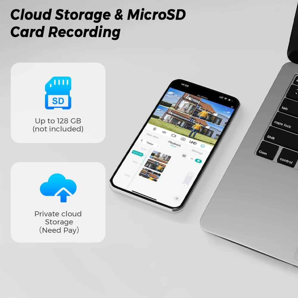 The camera supports up to 128GB TF card local backup and also provides cloud storage service(Need to pay extra cost).